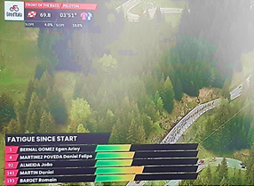 Natürlich ist Erschöpfung bei allen Fahrern durch den metabolischen Leistungsumsatz unausweichlich, 2021 gab es beim Giro dazu eine hochinteressante Grafik, die kaum jemand bemerkt hat, die Einblendung dieser Datenauswertung ist übrigens nie wieder bei einer Radsportübertragung erfolgt. Im Etappenergebnis kommen dann auch tatsächlich die weniger ermüdeten Bernal, Martinez, Bardet und Almeida in der Spitzengruppe an, während Martin über 3min verliert [13]. Die Kalkulation erfolgte wahrscheinlich durch Auswertung der HRV (Herzratenvariabilität) über Velon [14].