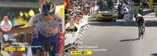 Hochinteressant sind die unterschiedlichen Ansätze der einzelnen Teams und Topfavoriten bezüglich des technischen Setups. Der Parcours war äußerst inhomogen gestaltet, zunächst mit drei flachen Kilometern, bei denen Zeitfahrmaschinen eindeutig Vorteile bieten. Die anschließenden Sektoren gingen eingangs mit 4,5 Prozent, danach mit 6-9% sowie auf den letzten 900m mit bis zu 13% Steigung bergan, also ein klassisches Terrain für spezielle Bergfahrboliden. Der überwiegende Teil der Rennfahrer entschied sich dann auch für die eher klassische Aero Straßenradmaschine, nur vier Protagonisten wählten ein modifiziertes Zeitfahrradsystem (Vingegaard, Lipowitz, Evenepoel und Roglic). Dabei wurden die Lenkerauflieger Aufsätze um bis zu 2cm höhergelegt, damit eine aufrechtere Position mit höherer Krafteinleitung in den Bergaufabschnitten ermöglicht wurde. Dabei wurde an jedem Gramm Zusatzgewicht gespart und teilweise Lackierungsschichten oder Lenkerbänder weggelassen, um dem UCI Gewichtslimit von 6,8kg möglichst nahe zu kommen [4].