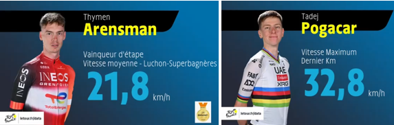 Die Geschwindigkeitsunterschiede der einzelnen Zeitfahrabschnitte stellen enorm variable neuromuskuläre Anforderungen an die Fahrer. Extrem kraftorientiert mit hohen Übersetzungen in dem Flachabschnitt und dann deutlich frequenzorientierter mit diametralen motorischen Höchstbelastungen in den Steilpassagen. Die Umschaltung dieser Fahrtrhythmuswechsel ist Pogacar mit dem gewählten Radsetup und Übersetzungsspektrum wohl besser gelungen als Vingegaard, obwohl theoretische Simulationen sicher die Zeitfahrradvariante empfohlen haben [6].