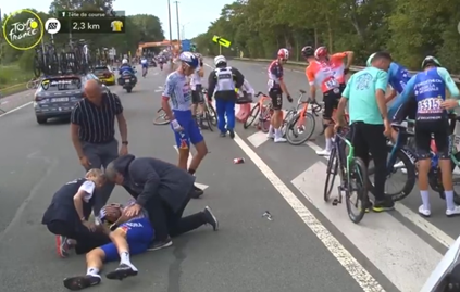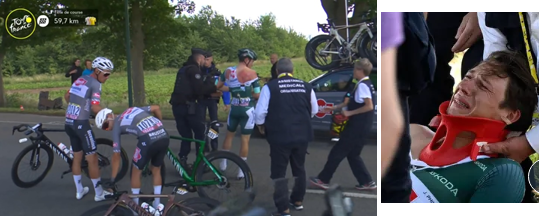 Anstatt aus dem schockierenden Vorfall am Zwischensprint Konsequenzen zu ziehen und etwas defensiver, sowie respektvoller miteinander umzugehen, rappelt es 3km vor dem Ziel und auf der Zielgerade erneut heftig, mit entsprechender Erweiterung des Tour Lazarettes. Gnadenlos wird der Erfolgsdruck, der Kampf um Arbeitsverträge und Sponsorengelder in all seiner abstoßenden Abartigkeit auf dem Asphalt ausgelebt.